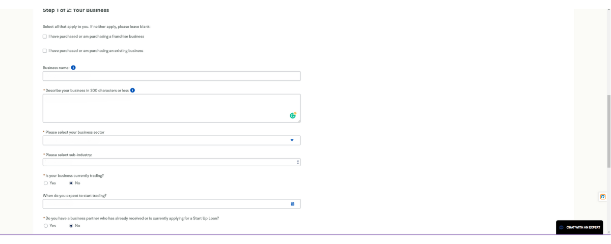 This page is to ask for details surrounding your business or the business that you are looking to startup. This includes the Business Name, a description of your business, the main trading activities, the Business Sector that the business comes under, and a sub-industry that your business comes under if the business is currently trading. This is all general information for your business and what you intend to do with the business.