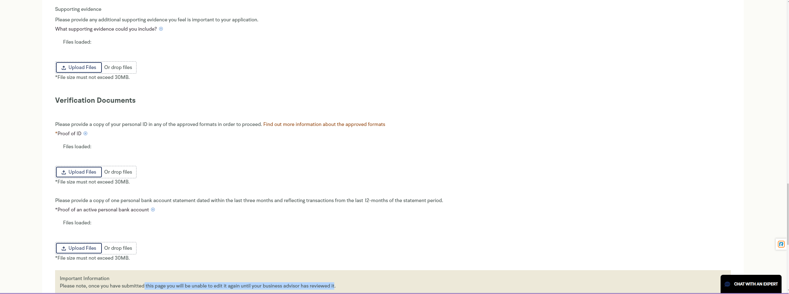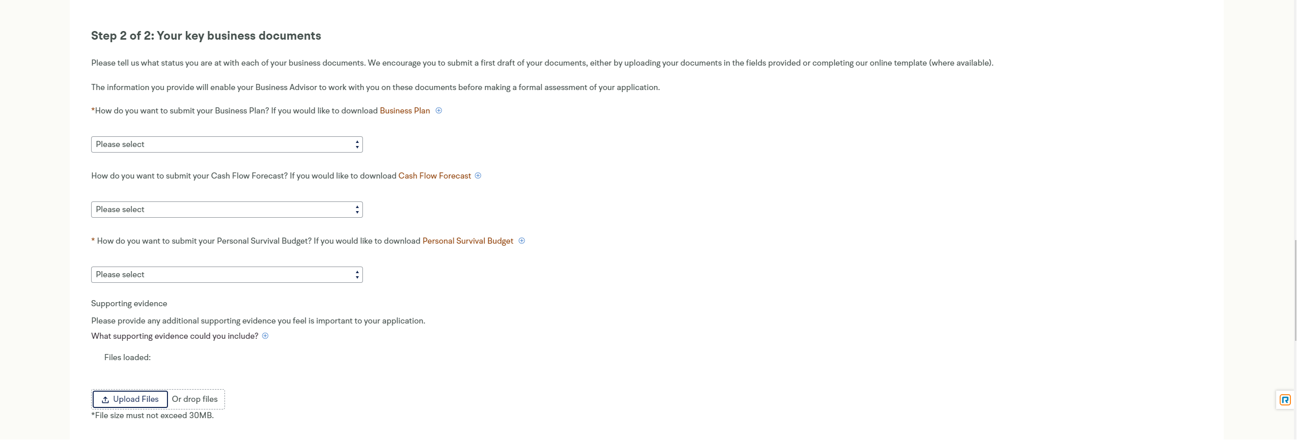 This page is for the documents that you are required to upload for the British Business Bank to complete your application. These documents are a Business Plan, A Personal Survival Budget, Sales Assumptions and a Business Cashflow Forecast. Once this page is completed you will be taken back to the portal and you will receive emails as your application moves through the system.