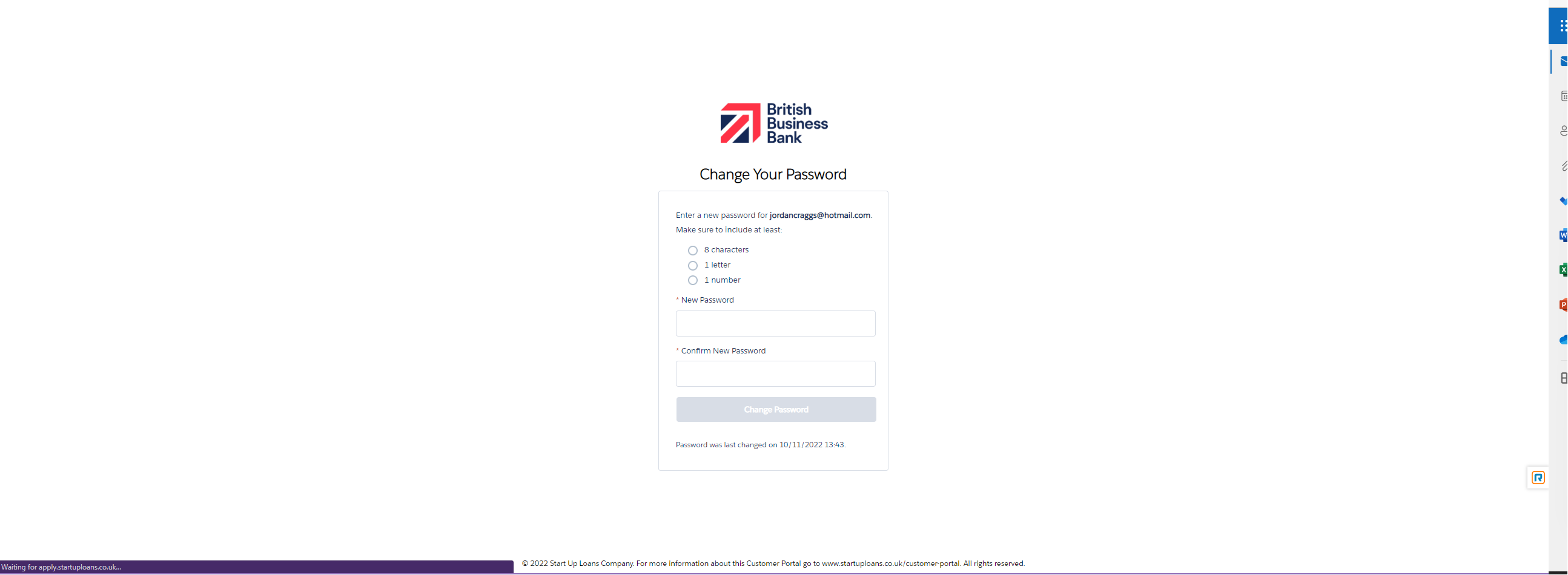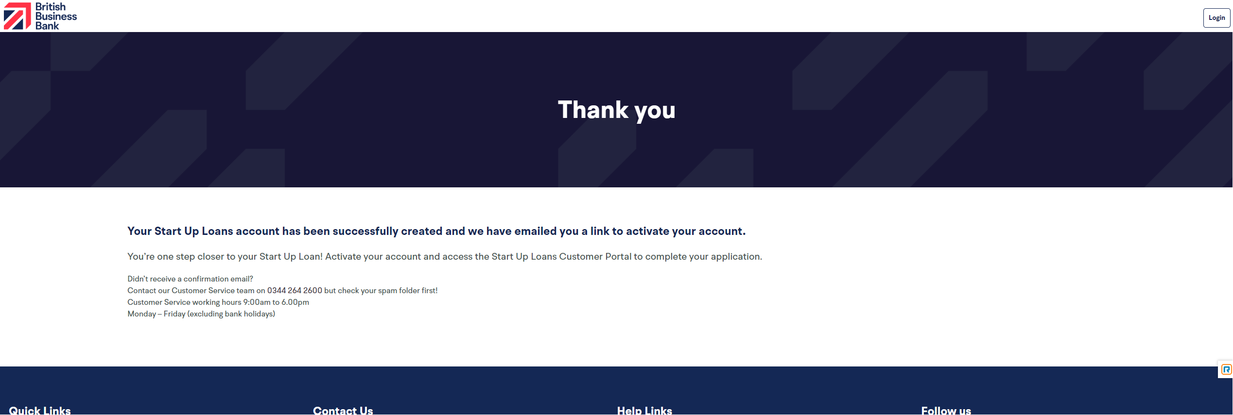 Once you have completed the personal information page you will be presented with this thank you page. Once you reach this page the British Business Bank will send you an email with an account activation link once you have activated your account you will then be presented with a page to create your own password which will then allow you to login to the portal at any point to continue or view your application and its progress.